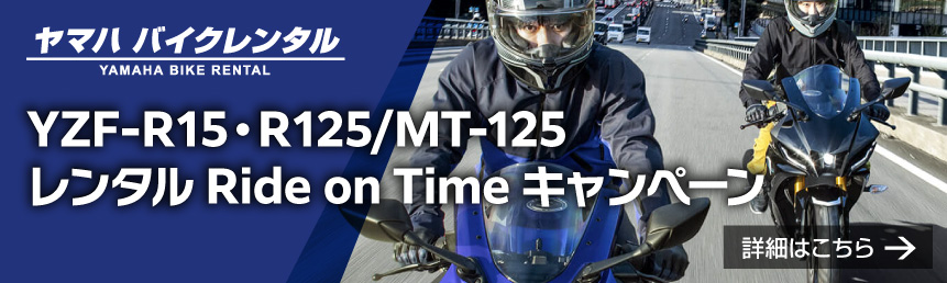 ヤマハ バイクレンタルYSP新潟でYZF-R125をレンタルいただいたお客様を対象に、レンタルご利用後YZF-R15・R125/MT-125いずれかの新車を用品クーポンキャンペーン協賛のヤマハ バイクレンタル加盟店でご購入いただくと、お支払い総額から上限10,000円(税込)までのレンタル利用料金分を車両購入代金の一部としてサポートします。